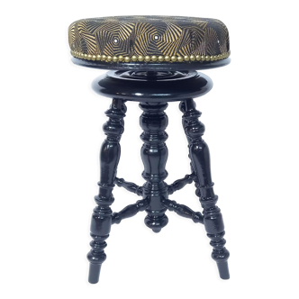 Very old piano stool, the mechanism is made of rotating wood, remade and covered with a modern velvet fabric, floral patterns surrounded by silver nails, .