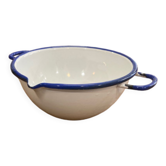 Duo of enameled metal fondue pots. Some enamelling defects.