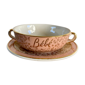 Lunch duo "toi & moi" in opaque porcelain from the digoin & sarreguemines manufacture. The cup is ecru with golden border and sage green inner and the saucer is sage green with golden border. The duo is in very good condition, and dates from the 50s. Size: Cup. ▫️d 11cm. ▫️h 6, 5cm. Saucer. ▫️d 18, 5cm. ▫️h 2, 5cm.