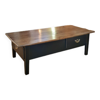 In the purest farmhouse spirit, I present to you this old kneading trough made of solid walnut, which has been transformed into a beautiful and large coffee table. Its removable solid walnut top, which is easy to fall in love with, lifts or slides to reveal a huge original storage space. At the end of the table, we find two spacious compartmentalised drawers with wooden handles for maximum storage 🙌. It has been completely sanded, treated, and then protected (both inside and out) with a natural colourless oil. Due to its beautiful dimensions, it will be ideal for a large chic country-inspired living room 👌. Height: 47.5cm. Length: 182cm. Depth: 90cm.