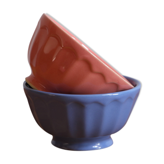 2 old earthenware bowls. Cream-white, flower/clover pattern. Height: 8 cm. Diameter: 14 cm. A bowl in very good condition. The other bowl with a chip and a crack.