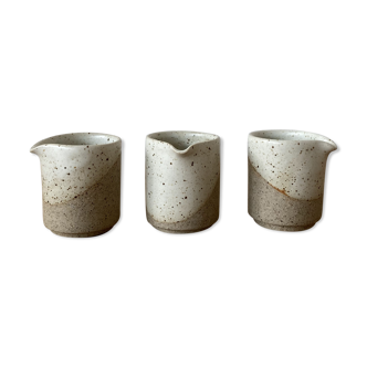 Rare tea or coffee service from the La Colombe Vallauris pottery which is distinguished by its matte enameled stoneware and its tachist patterns, made in the 60s. Large pot dimensions: h 17 cm diameter 12 cm. Small pot: h 11cm diameter 7cm. Cup: h 10 cm diameter 5 cm (4 cups) Signed intaglio with a dove and the name of the pottery. Excellent condition.
