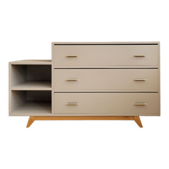 TV cabinet chest of drawers. An old chest of drawers that incorporated a refrigerator into the door, hence the marks. Completely repainted in beige and a wooden top was added to match the interior. Length 148 cm. Depth 55 cm. Height 77 cm. Cupboard side. Length 49 cm. Depth 52 cm. Height 62 cm. Drawers. Length 81 cm. Depth 42 cm. Height 12.5 cm.