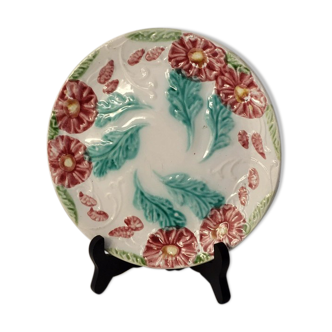 A pair of earthenware barbotine plates from the Longchamp factory, showcasing the decorative craftsmanship of the late 19th and early 20th centuries, reflecting a rich and expressive decorative work centred around a floral motif. Each plate features a large relief leaf in celadon green hues, finely modelled, accompanied by a rim adorned with a delicately polychrome floral frieze on a deep blue background, punctuated by small red berries. An interesting detail: the two pieces are not strictly identical. Subtle variations can be observed in the modelling, relief, and hues, revealing a production where handwork and firing impart uniqueness to each piece — the charm of barbotine. The edge is highlighted with a warm brown line, which structures the whole and enhances its authentic character. There is an embedded marking of 1107 G and Longchamp, which is not very visible but present. In good vintage condition, with some discreet signs of age, micro-wear, small points related to firing, light signs of use, well-preserved reliefs, and very legible decoration (see photos). Diameter 21.5 cm. Authentic charm, perfect for a vintage botanical decoration that is both current and embodies a reimagined country house spirit and material aesthetics.