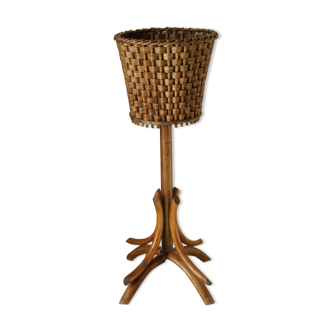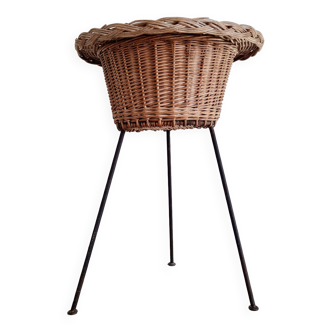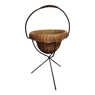 Beautiful vintage seamstress worker from the 1960s, twisted black metal tripod base, wicker basket and lid, interior covered with an original Renaissance scene style fabric, two large wicker loops for handles. In good condition. Basket diameter: 35. Base diameter: 55.