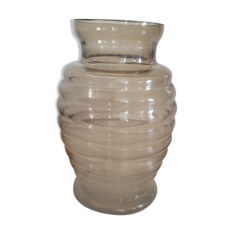 Glass vase, ring pattern in relief. Water green color. Height: 19 cms. Diameter at the base: 10 cms. Neck diameter: 7.5 cms. Diameter at the widest point: approximately 15 cms. Weight: 0.550 kgs