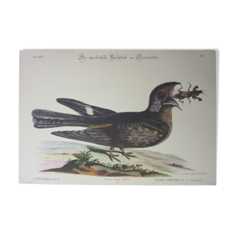 Ornithological engraving of a small crested blackbird from china, enhanced with watercolor. 18th century period, signed françois nicolas martinet. Mahogany-colored wooden frame. A hanging point on the back. Foxing and stains on the engraving. Good general condition. Dimensions: 33 X 28 cm.