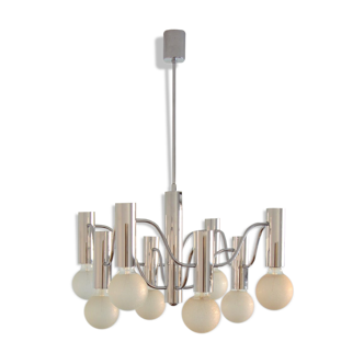 Large-sized chandelier in gilded metal and black lamps. 15 lights, halogen bulbs 40w cap gy6.35 12v (included). Do not hesitate to contact me for more information.