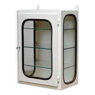 In metal with glass door this cabinet or electrical box with a glass door sarel can become26.5 in good used condition without key. Its dimensions are 61.5 cm high, 42 cm long and 26.5 cm wide. With the cleats, it measures 29 cm wide. The cabinet is made of lacquered sheet steel, with a glass door.