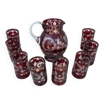 Antique liqueur service consisting of a jug, six glasses, and a tray, lovely pieces, in very good condition. Jug height 18cm, diameter 12cm, capacity 1L Glasses height 8cm, diameter 6cm, capacity 10cl. Tray diameter 28cm. Total weight 2.170kg.