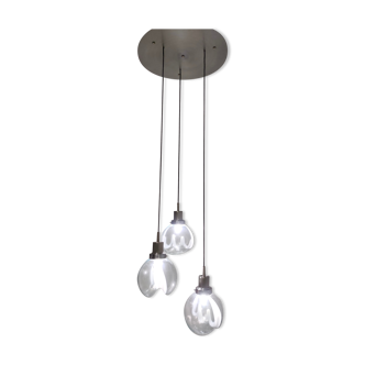 Vintage ceiling lamp with three light points, featuring glass diffusers and a brass structure with enameled parts. It has 3 E27 bulb sockets. The lamp is in good condition, with minor signs of wear. We try to present the actual condition of the lamps as completely as possible with the photos. If some details are not clear from the photos, the description prevails. Roadside delivery.