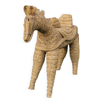 Cement planter. Depicting a donkey carrying a basket on its back. The joined legs are decorated with foliage (see photos) Height (ears): 79 cm. Width (basket): 41 cm. Length: 67 cm. In his juice, he has a small accident in one ear (photo 2).
