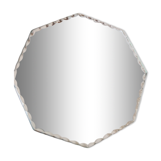 Large octagonal standing mirror, bevelled. 1940s. High-quality craftsmanship and superb bevel work. Thick and heavy mirror: 1.1kg. Dimensions: 30cm X 30cm. Rare small spots of missing silvering and superficial micro-scratches from use. Fast shipping in careful and secure packaging.