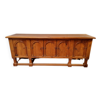 Oak sideboard from the 1950s, original format with its high feet that give it the look of a trade furniture / island. It has two doors and is in good general condition, solid and stable it has been treated against woodworms. Length: 125 cm. Height: 91 cm. Depth: 50 cm. Height of feet: 40 cm.