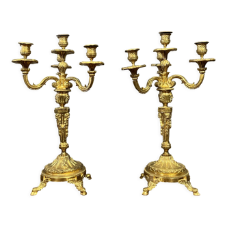 2 church candlesticks, 45 cm high and 20 cm wide. The base of the foot measures 14 cm by 14 cm by 14 cm. On each of the candlesticks, a candle and a flower are missing, and on the other candlestick, the branch is missing, the cake is missing, the candle. But as the candlesticks are well supplied, this is not too noticeable. The color is golden in places and black-green in other places, which gives them an aged appearance.