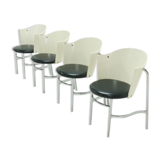 Set of 6 designer chairs in oak and leather from the 1980s. France. A set of six chairs with an architectural design, typical of the 1980s, combining light oak and black leather seats. The armrests and backrests made of panels provide a graphic presence, with clean lines and a beautiful visual stability. The metal base, simple and discreet, lightens the overall look and enhances the design spirit of the era.
