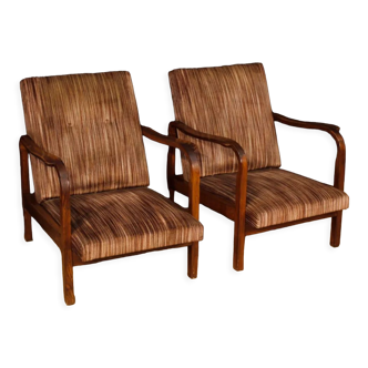 Pair of Art Deco armchairs in curved wood and multicoloured fabric from the 1920s.