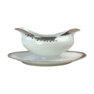 Saucière in white porcelain decorated with gold edging and gilded frieze of stylized fleurs-de-lis. It is in good condition except for some small wear to the gilding.
