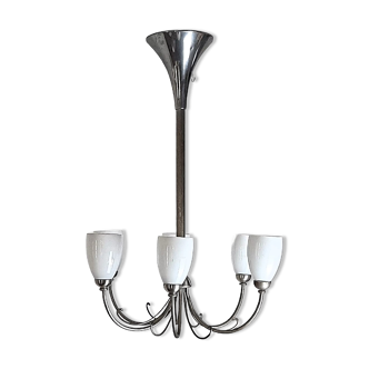 Stunning art deco chandelier. Art deco chandelier rosewood and chrome column, three chrome branches holding the original domed glass shades, the central rosewood octagonal plinth holding three chromed dancing figures. 100 cm drop 70 cm dia. French c 1930.
