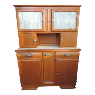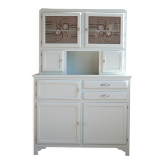 Old mado buffet from the 50s restored. Silver gray color from id (which is actually a soft green) for the body of the furniture and pure satin white from tollens for the interior. Wooden parts sanded and matt varnished. Varnish was also put on the paint for easy cleaning. The interior shelves were sanded and varnished as well. The hinges have been cleaned. The buttons are all original and have been cleaned. They are made of aluminum. The mirror has an engraving of a swan. A pretty wallpaper covers the bottom of the drawers and the inside of the upper part. The bottom of the furniture is painted entirely white. The doors all close with that characteristic little sound of mado closings! Careful restoration. The buffet is in 2 parts. This piece of furniture is located in the north (59).