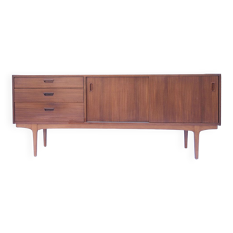 Beautiful enfilade by McIntosh, shallow but offering a lovely storage space. Very elegant on its tall legs, with its elongated wave-shaped handles. Set in very good condition! H76 X W200 X D41 cm.