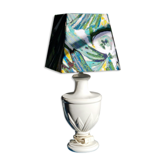 Table lamp, old turned wooden foot, metal lampshade and art deco print