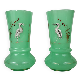 Large decorative jar in solid wood painted with bird decoration. This jar, probably from asia, was pierced to serve as a lamp foot. It is decorated with wading birds, an egret and a flemish and is 57 cm high.