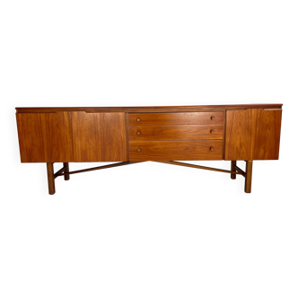 This highboard was made in Denmark in the 1970s. Its frame is teak veneer. Its legs are made of solid wood. Its surface has been refreshed. Inside, four practical, height-adjustable shelves and three large drawers complete the space. The cabinet is equipped with practical sliding doors, which reduce the free space in front of the cabinet without restricting access to the interior. In addition, these sliding doors are ideal for use under a stereo system. Its illuminated bar, featuring a decorative mirror and an adjustable shelf, is an additional highlight. Condition: The cabinet's surface has been refreshed. Light scratches and marks are visible. More significant signs of wear are always visible in the photos. Product ready for use. *For safety reasons, the cabinet's legs can be unscrewed and the sliding doors and shelves removed for transport. Assembly should not be a problem. If in doubt, please contact us and we will send you an instruction video. Technical data height: 114.5 cm width: 210 cm depth: 45.5 cm.