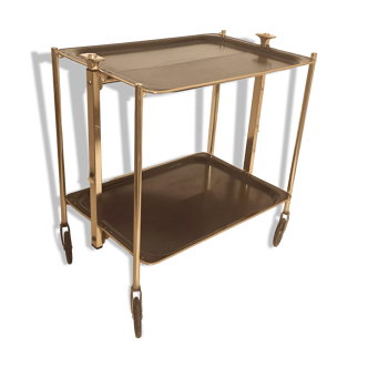 Vintage serving trolley, bar trolley, trolley, tea trolley, rolling table brown, 70s germany. Wonderful serving trolley from the 70s. It can be folded up very easily with an automatic push. The beautiful brass wheels are easy to move and so the good piece can be moved very well to the desired place. Plastic surfaces have a wood look and are in very good condition. Light patina on the metal and the wheels. Wheels are stamped: sw|made in germany. Dimensions: Width: 67 cm|26.37 inch. Height: 62 cm|24.40 inch. Depth: 41.5 cm|16.33 inch. Folded: 85 cm (33.46 inch) X 67 cm (26.37 inch) X 7 cm (2.75 inch) Weight: approx. 5.7 kg.