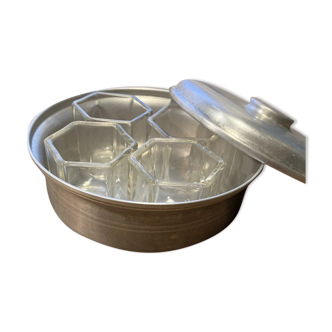 Service consisting of 4 egg cups and a salt shaker presented on a rectangular tray. The set is made of pretty blue molded glass with stylized flower decorations. Typical of the 1940s, one of the egg cups has retained its original label vallerysthal, déposé. This factory, located in lorraine, is one of the oldest glassworks and crystal works in france. An egg cup and the dish are a little chipped but it is not very visible. Tray: 37x15cm egg cup: 5.5cmx4.5cm salt shaker: 9x7.5x2.5cm.