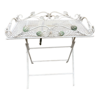 Vintage black wrought iron magazine rack with yellow wicker imitation weave on top in plastic as was done in 1950/1960 a shelf underneath and in bamboo the four legs have a bronze tip and a plastic pad missing a pad black paint has traces of wear the table is left in its condition at the buyer's choice. In very good condition.
