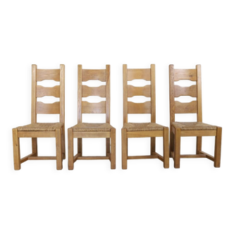 4 solid wood chairs and straw-covered seats. Modernist, brutalist furniture, Aranjou edition, France 70s/80s. Seat height 46 cm. Seat width 41 cm. Seat depth 32 cm. Height at the back of the backrest 96.5 cm.