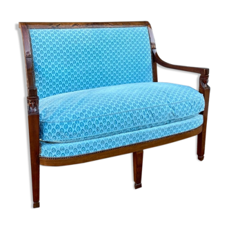 Empire period hooded sofa in walnut. The woodwork is in excellent condition. The upholstery is original, covered in used yellow wool velvet. Seat height: 48.