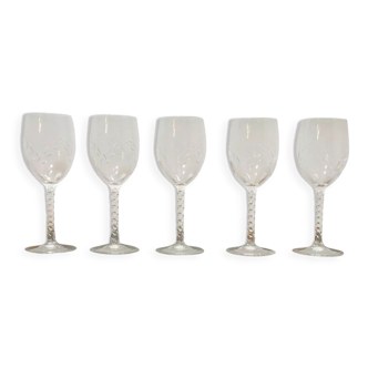 6 crystal champagne flutes, beautiful condition, good quality. Twisted feet, engraved ears of wheat. Height 21cm feet diameter 6.5cm.