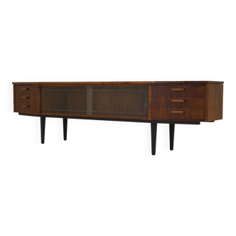 Small cabinet a chest of drawers with vintage walnut veneer 60 low cabinet, eg bedside cabinet, with long legs. Two small drawers for small items and a shelf with sliding glass. Long black slender taper legs set at an angle. Walnut veneered shelf. Good condition with signs of use. A modern combination of black and wood veneer for the 1960s. In our other advertisements there is a long board sofa, a large library and a small bookcase from the same set.