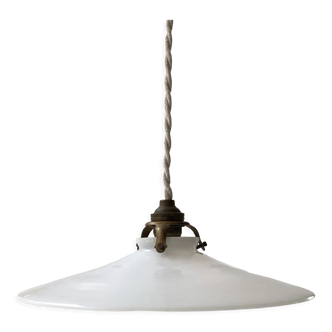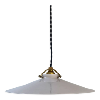 White opaline glass pendant light from the 1950s. Very good condition. The wiring has been redone. Brass bayonet socket (B22). Brass claw. 1 meter of flat, 2-strand black wire. Fast and very careful shipping.