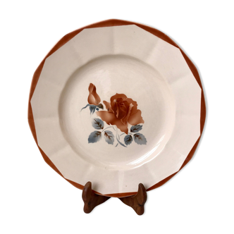 Large antique serving platter in stamped Sarreguemines earthenware – model 9181. Brown and blue floral decoration on pinkish beige earthenware. Diameter: 31 cm, weight: 955 g. Excellent condition, no chips or cracks, beautiful shine.