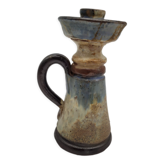 Very beautiful iconic piece in beige enameled stoneware with blue drips, French work circa 1950. Rare model with the handle attached to the neck, like a small loop, this pitcher fully assumes its purely decorative quality! Beautiful condition. No enamel defect apart from a tiny chip inside the neck (almost invisible), no loss to the spout. Height: 29 cm width from spout to handle: 20 cm diameter at the base: 12.5cm Fast shipping, careful packaging.