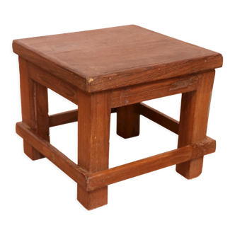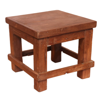 Antique stool made of raw wood. Oak and fir. Sanded and cleaned wood. Signs of wear. Antique workshop stool, traces of nicks and dents. Minor paint marks. Large stool, ideal as a side table or nightstand. Two identical ones available. Sturdy.