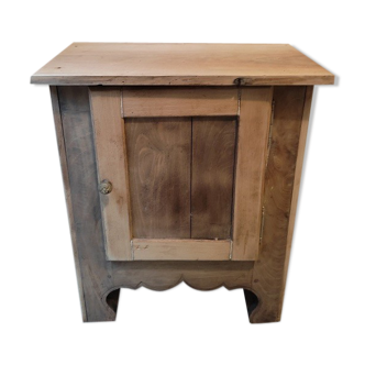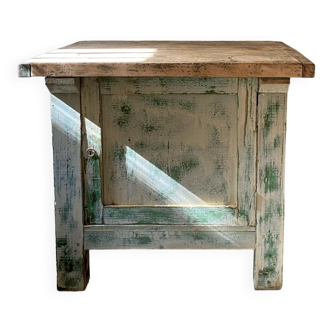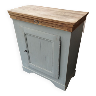 Old wooden carpenter's workbench with its vice and closed storage. Professional furniture in very good condition with its wooden top patinated by work. It is completely cleaned, treated with raw finish for the top and blue gray for the furniture. It is ready to be installed. It has dimensions that are easy to place in a serving kitchen, in an entryway to store keys or even in a living room. Dimensions width 120 cm - depth 52 cm - depth without vice 45 cm - height 74 cm.