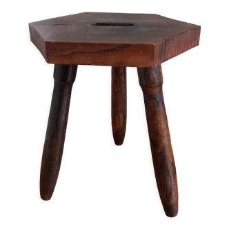Vintage tripod stool, mahogany-colored worked wood, 6 sides and a clover-shaped hole in the center for a good grip, height 39cm.