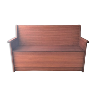 Corner bench in rustic wood, with trunk. Can be put in a veranda or children's room.