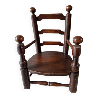 Small old children's low armchair in wood, cane seat with armrest, small metal hook on the right side of the armrest in good condition.