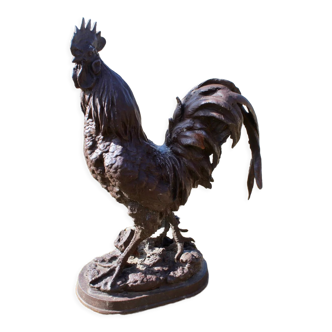Magnificent rooster and its faience vase made in france in the 1880s. This majolica composition is both a flower vase and a rooster sculpture. This superb piece of faience with wonderful details is hand-painted with a vivid palette of red, blue, green, beige and red. Remarkable attitude of the rooster, dramatized and proud, tail in a plume and chest out. Signed on the base by the artist p. Comolera. Some damage and cracks but generally good condition for the age of this piece. Remarkable quality and rare decorative object.