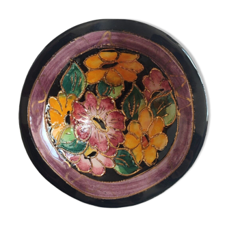 Flat ceramic plate, diameter 20 cm. Vanilla background, brown flowers with orange pistils, some green touches. A ginning on the back, (at the end of the arrow).