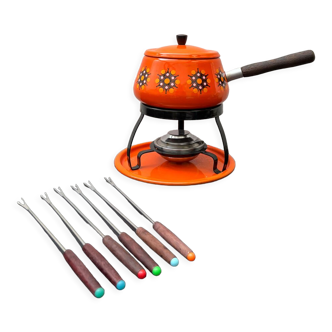 Fondue kit (meat or cheese) in enamelled metal with a very seventies decoration, with flowers on an orange background. Interior like new. Two defects: wear on the handle and a lack of paint inside the stove.