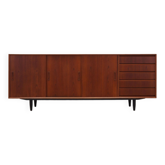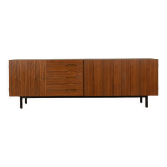 XL modernist sideboard by Behr Möbel (Germany, 1950s). This striking modernist sideboard was produced in the 1950s by the renowned German manufacturer Behr Möbel, best known for the iconic B40 model. Expertly crafted from rich teak wood, the piece rests on a sleek metal base that adds to its architectural presence. It features four drawers and three doors, offering generous storage space with adjustable shelves inside. The sideboard is in very good condition, with fully functional locks.