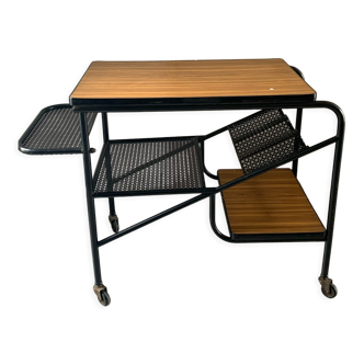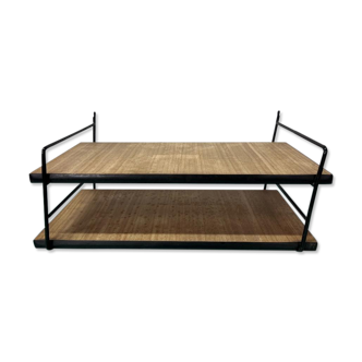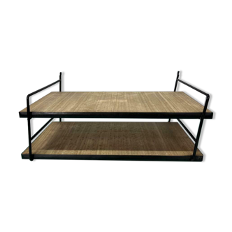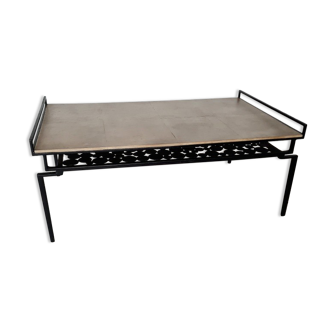 60s coffee table with metal vinyl doors. Black metal structure on wheels. Original tray, wood décor. Chinée rue turennes in bordeaux.
