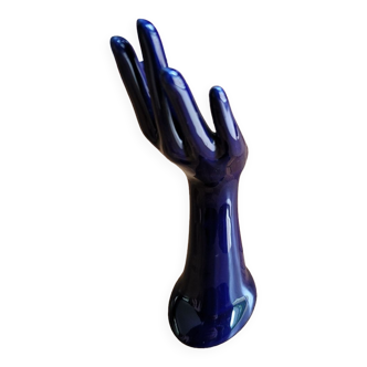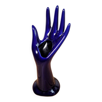 Brown ceramic hand with mustard yellow drips. Typical object from the 70s that can be used as a ring holder or a single-flower vase. No signature. Very good condition.