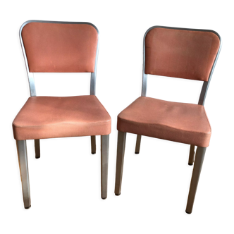Here is a pair of very nice chairs in a modernist style, simple and elegant, as well as practical and comfortable. They probably date from the 1970s. They will be perfect for adding a retro touch to an office, a waiting room, or why not paired with other models around a dining table. The square-section tubular structure is made of chrome metal, and the seat and backrest are in black faux leather. They are in good structural condition, sturdy, with well-maintained padding, but they do show signs of their age and use: small punctures, holes, abrasions, and marks on the faux leather, slightly pitted or cloudy chrome in places with some areas of superficial corrosion (at the junction between the seat and backrest, and on the back of one leg). Under one of the two chairs, the jaconas fabric is torn. They are therefore to be adopted with their flaws and can still serve for years like this before, I hope for them, a restoration or reupholstering. They measure 80 cm in maximum height, 47 cm in seat height, 41 cm in maximum width, and 49 cm in maximum depth.
